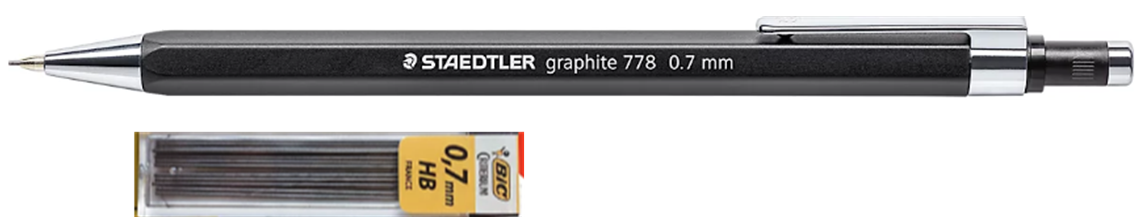 Diese Stifte mit Minen 0.7 passen gut in die feinen Linien der Schablone.(Feinminenstift, Staedler, Rotring, Pentel etc.)